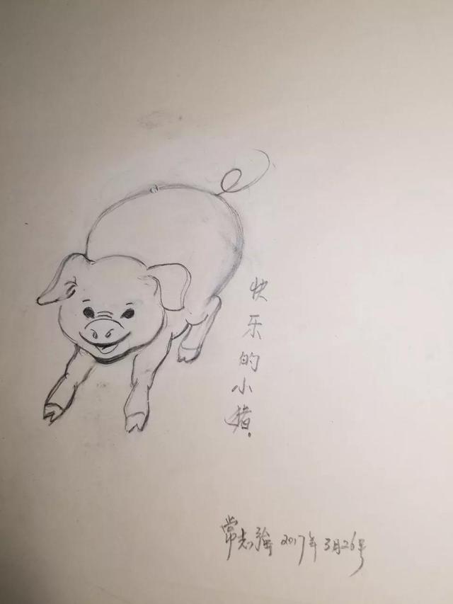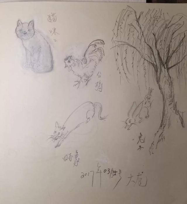 然后他就画了个猫,画了一只鸡,然后他画了小狗。然后他画完以后,他说不像小狗,他自己写了个四不像。