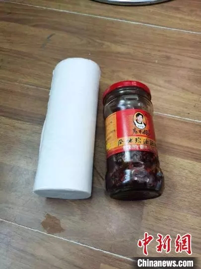 被盗的“老干妈”辣椒酱和一卷用过的餐巾纸。乐清公安供图