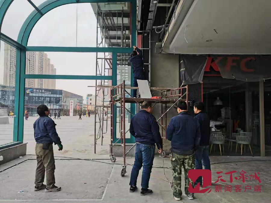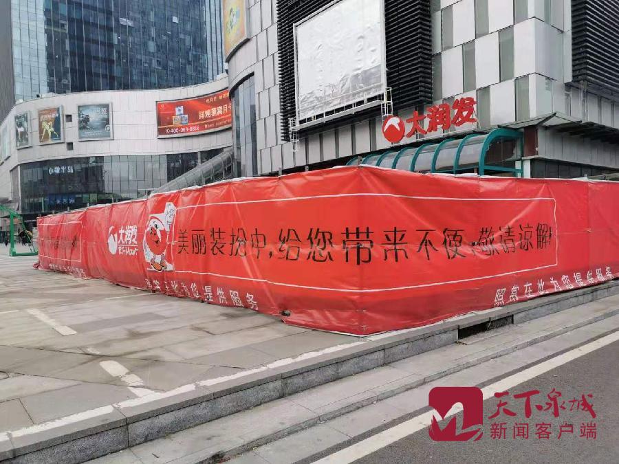 在现场,天下泉城客户端记者看到在超市入口处的空地上,部分区域正在隔离施工,施工围挡上印有“大润发,美丽装扮中,给您带来不便,敬请谅解”的字样。大润发多年来的“好邻居”肯德基,店面装修已进入尾声,还有几家其他店铺也正在装修施工中。