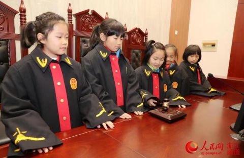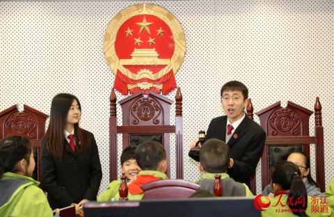 12月14日,浙江省湖州市德清人民法院开展了以“与法共成长”为主题的法院开放日活动。在法官的带领下,逸夫小学的小学生们穿上法袍,坐上审判席,敲响法槌,过了一把“法官”瘾