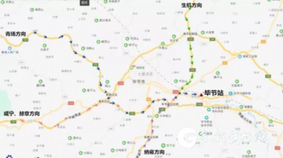 生机、林口→厦蓉高速→毕节站(高速)→碧阳二道→碧阳二道与梨寨路交叉口(左转)→碧阳大道→毕节高铁站。