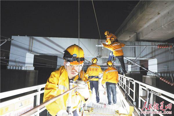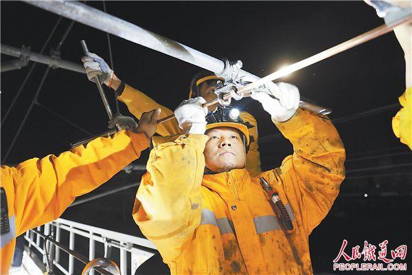 为全力打赢“三保三增”攻坚战,近日,南宁供电段组织职工对黎湛线一锚段进行接触网换线施工作业,及时消除设备隐患,保障了接触网的供电安全。图为该段职工在黎湛线对接触网设备进行精调。冯卫峰 摄