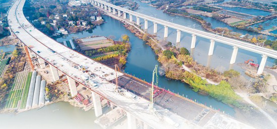 (12月15日,无人机拍摄的商合杭铁路芜湖长江公铁大桥公路接线工程江北接线桥浇筑施工现场。新华社记者刘军喜摄)