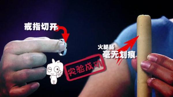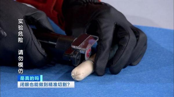 赵铁家带上眼罩,拿起手持小型切割机,对套在香肠上的戒指进行了切割。竟然成功切断了戒指,香肠则是完好无损,而且表面没有留下任何划痕,真是太震撼了。