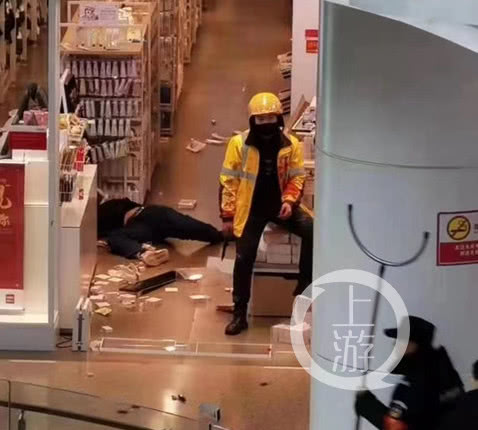 上游新闻此前报道《武汉一身穿美团外卖服男子商场持刀行凶 伤者已送医治疗》显示,多段视频显示,一名身穿美团外卖制服、头戴黄色头盔的男子坐在商铺货架上,手拿一把匕首,身旁倒着一名黑衣人,一动不动,商品散落在地上。行凶男子走出商铺后,警方和商场保安手持钢叉和盾牌将其围住。随后,男子被逼到护栏边,被迅速控制。