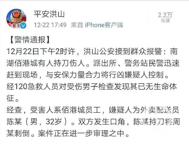 22日下午6时许,洪山警方微博公号@平安洪山发布消息称:下午2时许,洪山公安接到群众报警:南湖佰港城有人持刀伤人。派出所、警务站民警迅速赶到现场,与安保力量合力将行凶嫌疑人控制。