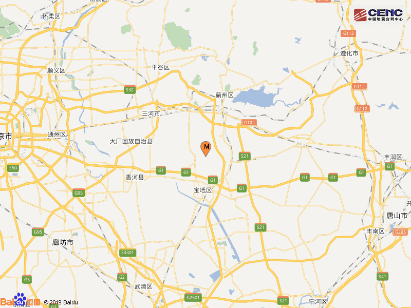 震中距河北三河市26公里、距河北大厂回族自治县29公里、距河北香河县29公里、距河北玉田县35公里、距天津宝坻区15公里,距北京市79公里。