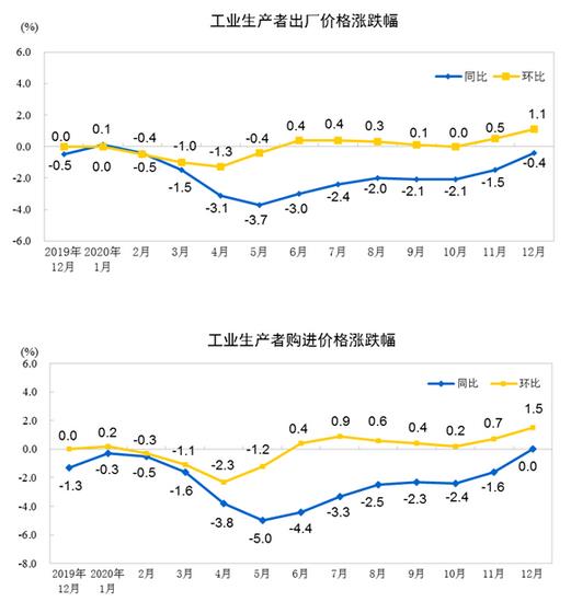 中新网1月11日电 据国家统计局网站消息,2020年12月份,全国工业生产者出厂价格同比下降0.4%,环比上涨1.1%;工业生产者购进价格同比持平,环比上涨1.5%。2020年全年,工业生产者出厂价格比上年下降1.8%,工业生产者购进价格下降2.3%。