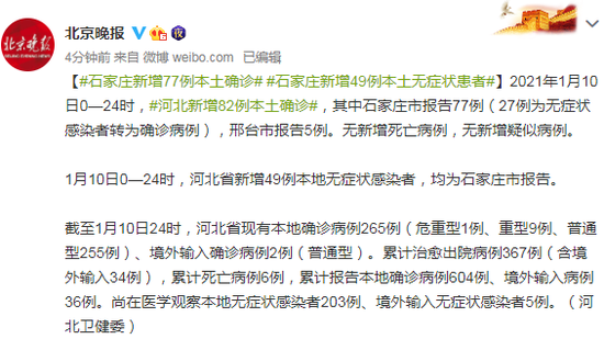1月10日0—24时,河北省新增49例本地无症状感染者,均为石家庄市报告。