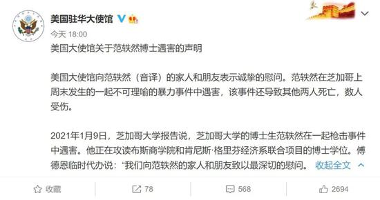 范轶然遇害的消息传回国内,引发关注。就连美国驻华大使馆都在1月11日发微博向范轶然的家人朋友表示慰问。