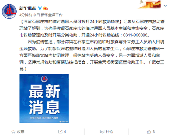 记者从石家庄市救助管理站了解到,为确保滞留石家庄市的临时遇困人员基本生活和生命安全,石家庄市救助管理站及时开展分类救助,开通24小时救助热线:0311-966008。