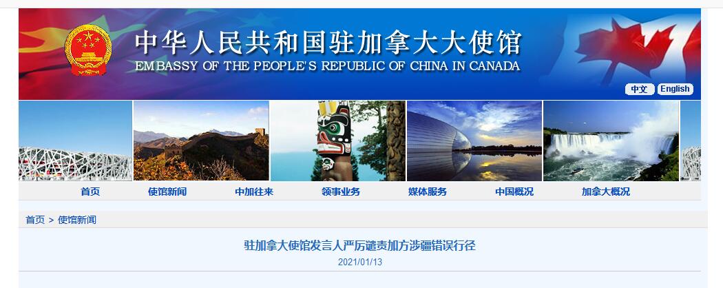 据中国驻加拿大大使馆网站1月13日消息,驻加拿大使馆发言人严厉谴责加方涉疆错误行径: