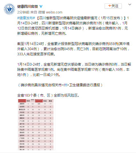 1月14日0-24时,四川新增新型冠状病毒肺炎确诊病例1例(境外输入,1月12日自印度尼西亚乘机抵蓉,1月14日确诊),新增治愈出院病例1例,无新增疑似病例,无新增死亡病例。