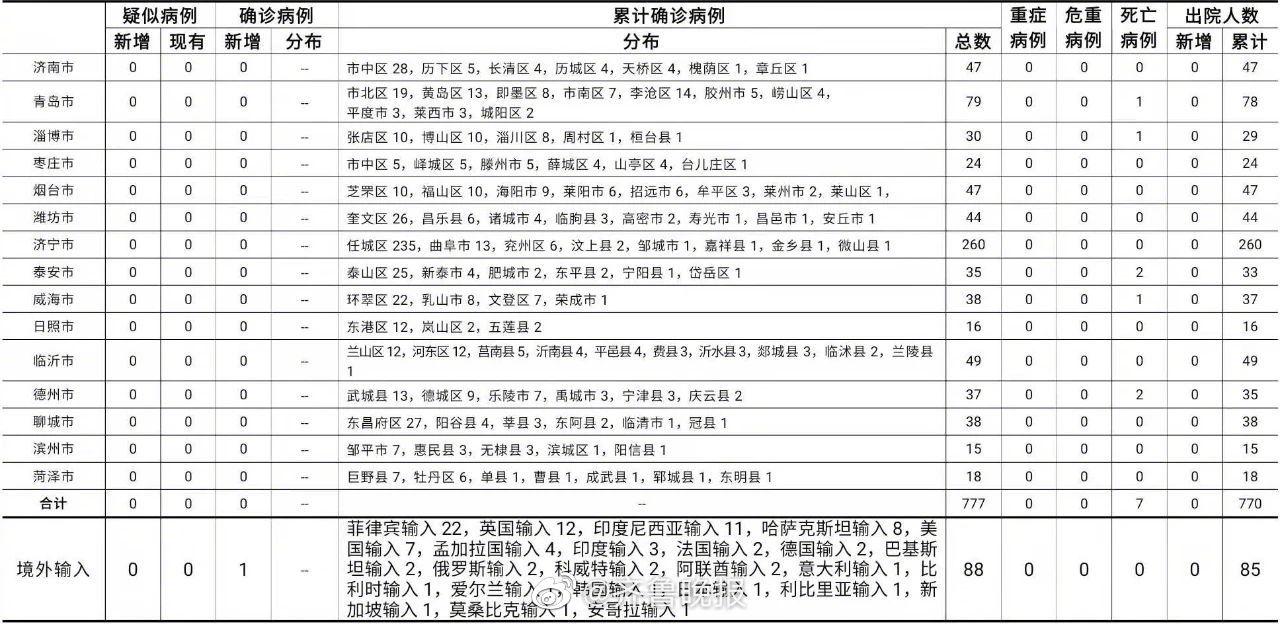 2021年1月16日0时至24时:山东无新增本地疑似病例、确诊病例。累计报告确诊病例777例,死亡7例,治愈出院770例。