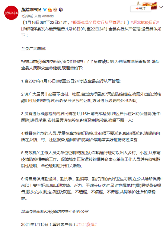 邯郸鸡泽县发布最新通告:1月16日0时至22日24时,全县实行从严管理!通告具体如下: