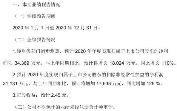 公告显示,业绩预告期间:2020年1月1日至2020年12月31日。预计2020年度实现归属于上市公司股东的扣除非经常性损益的净利润31,131万元,与上年同期相比,预计将增加17,533万元,同比增加129%。