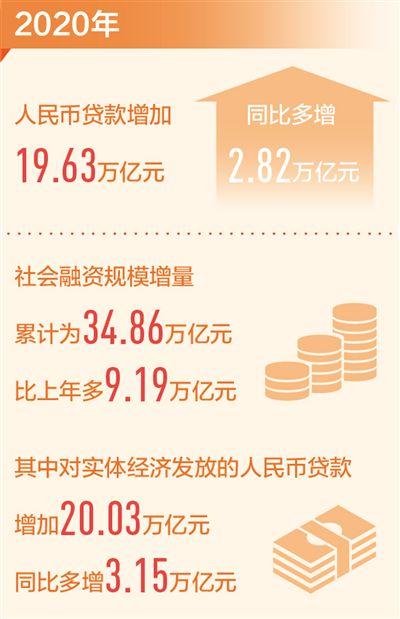 人民银行发布的最新数据显示,2020年,我国人民币贷款增加19.63万亿元,同比多增2.82万亿元,社会融资规模增量累计为34.86万亿元,比上年多9.19万亿元,其中对实体经济发放的人民币贷款增加20.03万亿元,同比多增3.15万亿元。源源不断的金融活水,让实体经济发展动力十足。