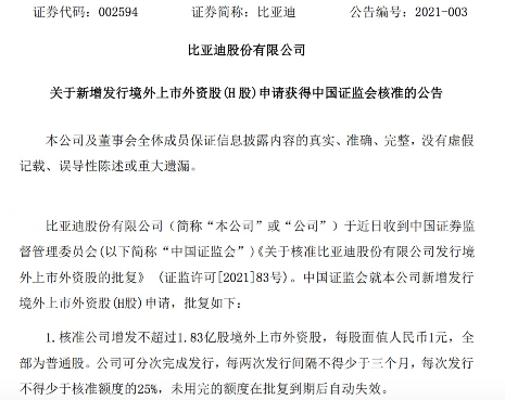 【TechWeb】1月15日消息,比亚迪发布公告称,于近日收到中国证监会《关于核准比亚迪股份有限公司发行境外上市外资股的批复》。
