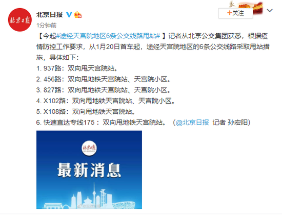 记者从北京公交集团获悉,根据疫情防控工作要求,从1月20日首车起,途经天宫院地区的6条公交线路采取甩站措施,具体如下: