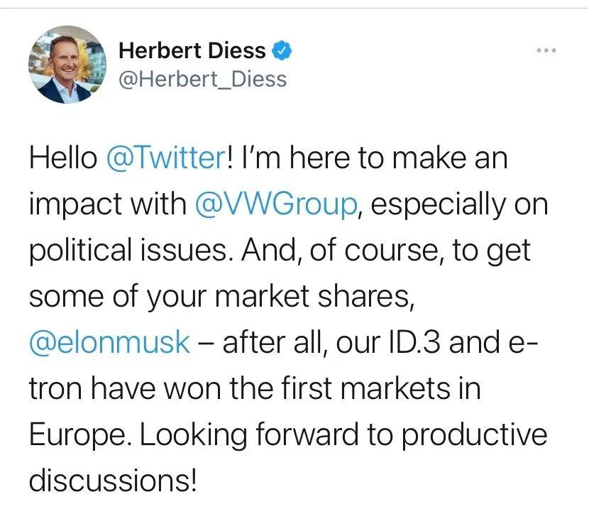 1月21日消息,大众CEO赫伯特·迪斯(Herbert Diess)于当地时间周三正式入驻了社交媒体推特,并很快发布了第一条动态,这条动态内容直指其竞争对手特斯拉,并喊话特斯拉CEO埃隆·马斯克(Elon Musk),要争夺特斯拉的部分市场份额。