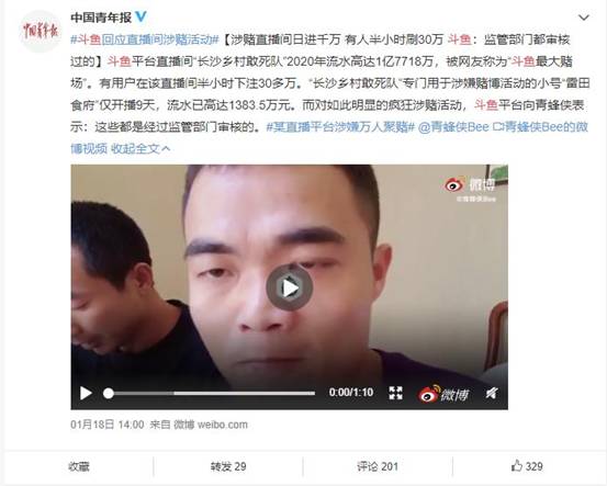 1月18日,斗鱼相关负责人就“长沙乡村敢死队”涉嫌聚赌一事,作出回应。该负责人称:“我们所有的(抽奖活动),都是要跟监管部门汇报才会上线的。”