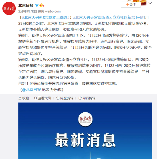 病例1,现住大兴区天宫院街道融汇社区。1月22日出现发热等症状,由120负压救护车转至区属医疗机构,核酸检测结果为阳性,综合流行病史、临床表现、实验室检测和影像学检查等结果,1月23日诊断为确诊病例,临床分型为轻型。转至定点医院治疗。
