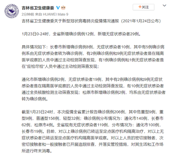 截至1月23日24时,本次疫情全省累计报告确诊病例206例,其中危重型9例,重型9例,普通型156例,轻型32例;确诊病例分布情况为:通化市140例,长春市62例,松原市4例。全省现有无症状感染者119例,分布情况为:通化市100例,长春市19例。目前,对以上确诊病例已转运至定点医疗机构隔离治疗,对以上无症状感染者已转运至定点医疗机构隔离医学观察。对以上人员的密切接触者、次密切接触者和一般接触者已开展追踪排查,并落实管控措施,对其生活和工作场所进行终末消毒。