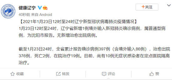 1月23日12时至24时,辽宁省新增1例境外输入新冠肺炎确诊病例,属普通型病例,为沈阳市报告。无新增治愈出院病例。