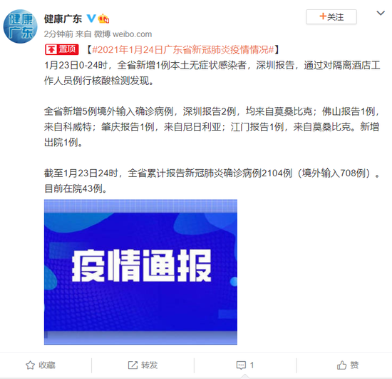 1月23日0-24时,全省新增1例本土无症状感染者,深圳报告,通过对隔离酒店工作人员例行核酸检测发现。
