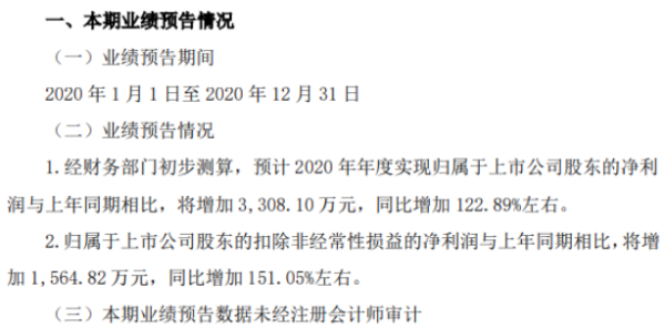 公告显示,业绩预告期间为2020年1月1日至2020年12月31日,预计2020年年度实现归属于上市公司股东的扣除非经常性损益的净利润与上年同期相比,将增加1,564.82万元,同比增加151.05%左右。