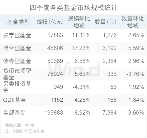 此外,债券型基金、货币市场型基金和QDII基金的规模也有小幅增长,环比增幅分别为6.58%、5.63%和4.25%。