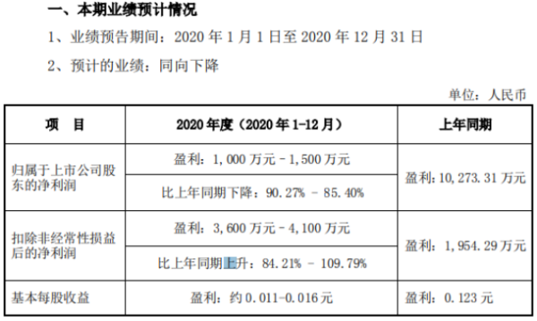 挖贝网1月22日,模塑科技(000700)近日发布2020年业绩预告,预计业绩同向下降。报告期内归属于上市公司股东的净利润1000万元–1500万元,比上年同期下降85.40%-90.27%;基本每股收益约0.011-0.016元。