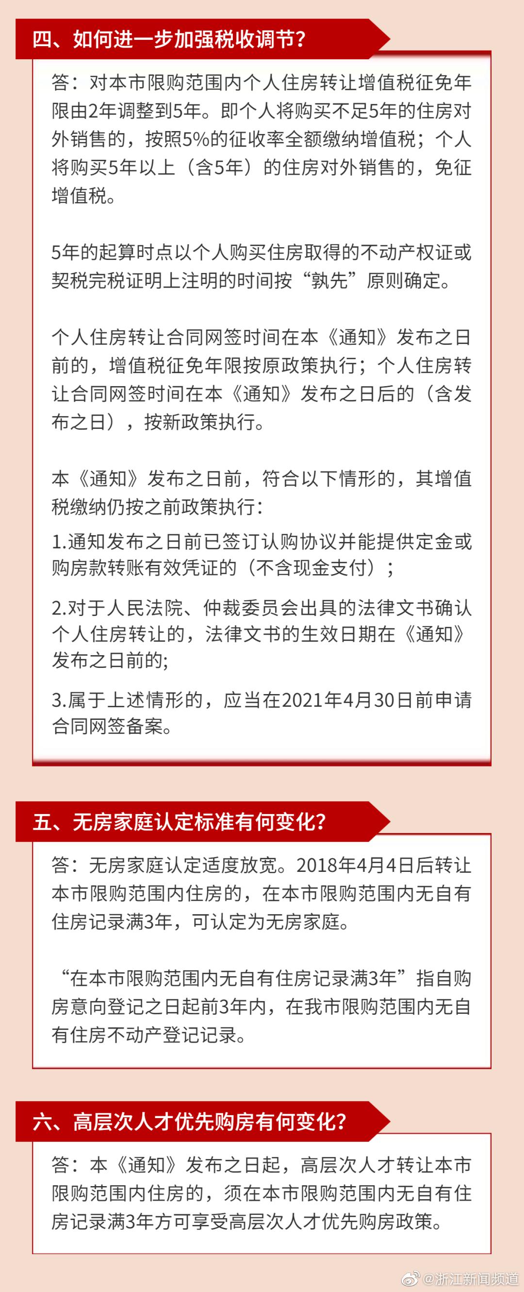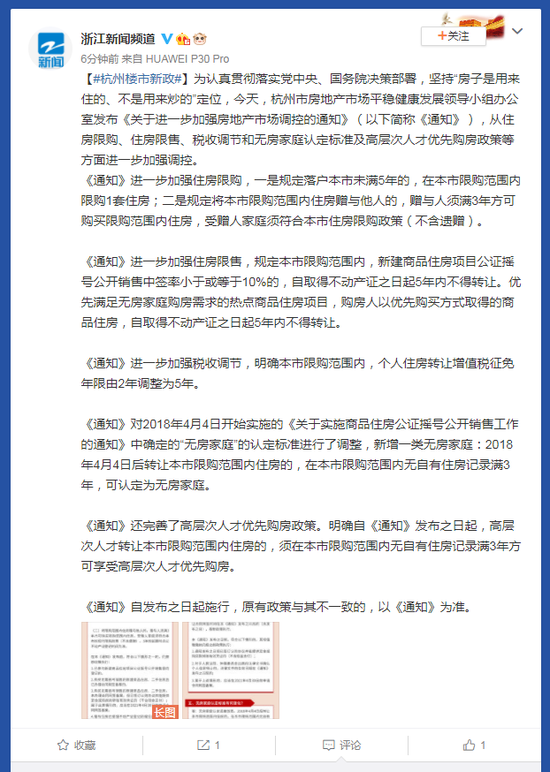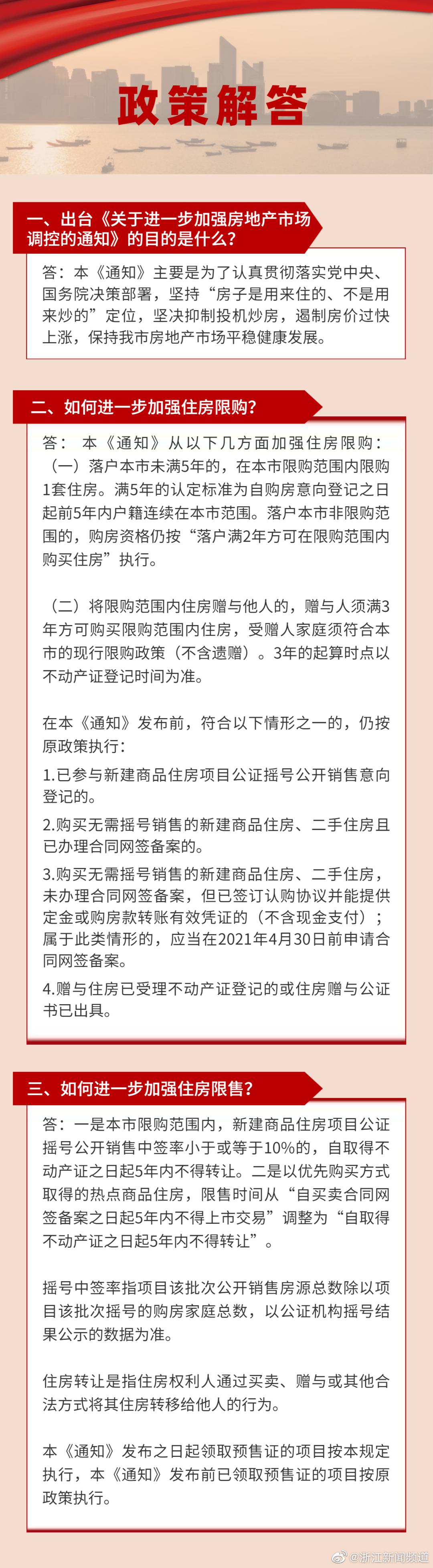 为认真贯彻落实党中央、国务院决策部署,坚持“房子是用来住的、不是用来炒的”定位,今天,杭州市房地产市场平稳健康发展领导小组办公室发布《关于进一步加强房地产市场调控的通知》(以下简称《通知》),从住房限购、住房限售、税收调节和无房家庭认定标准及高层次人才优先购房政策等方面进一步加强调控。