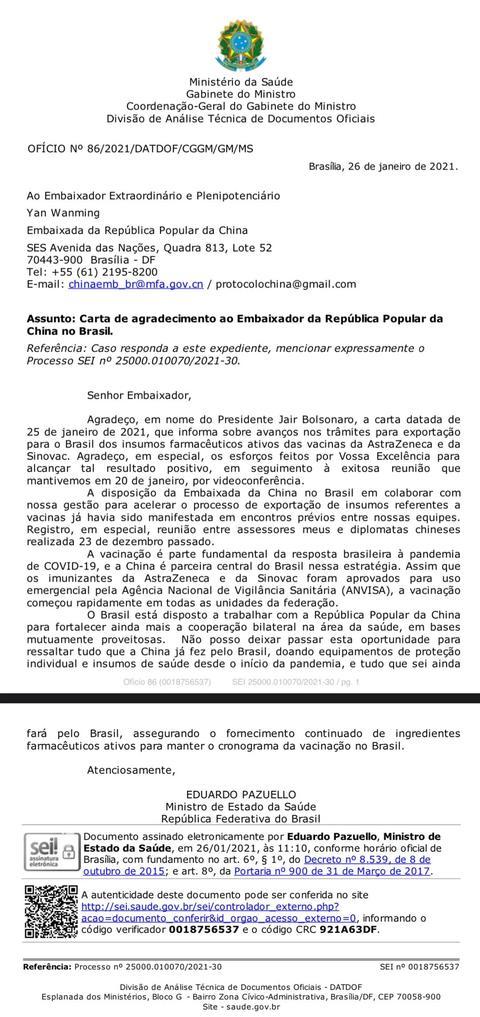 海外网1月27日电据中国驻巴西大使馆微信公众号消息,1月26日,巴西卫生部长帕祖洛致函杨万明大使,代表巴西总统博索纳罗感谢中国支持巴抗击新冠肺炎疫情。