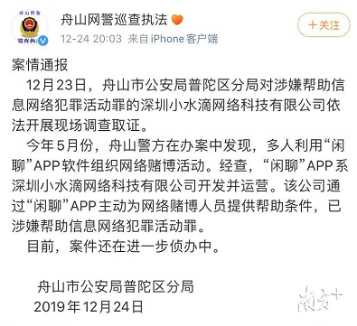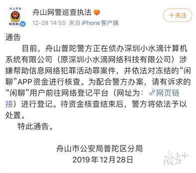 “目前,舟山普陀警方正在侦办深圳小水滴计算机系统有限公司(以下简称“小水滴公司”)涉嫌帮助信息网络犯罪活动罪案件,并依法对冻结的“闲聊”APP资金进行核查。”12月28日,浙江舟山警方再次发布微博,回应网友对闲聊账户资金提取问题的关注。