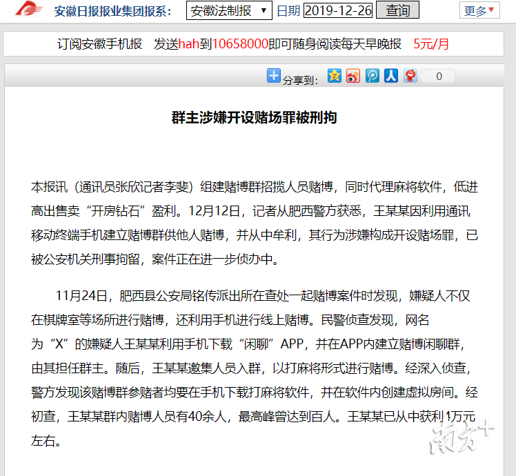 今年11月安徽省肥西县公安局在查处一起赌博案件时发现,网名“X”的嫌疑人王某某利用“闲聊App”在线上组织赌博活动,通过在App内建立赌博闲聊群,由其担任群主。随后,王某某邀集人员入群,以打麻将形式进行赌博。