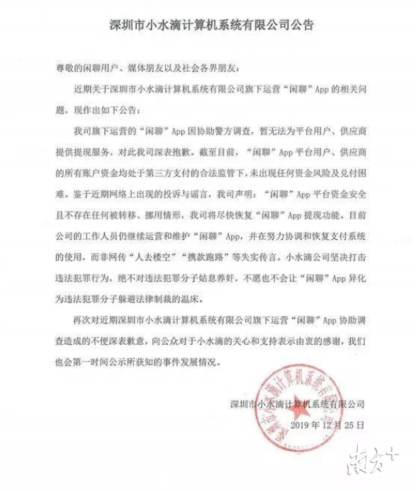 12月25日,小水滴公司在部分媒体上发布了一封公告,文中称会尽快恢复闲聊App的提现功能。