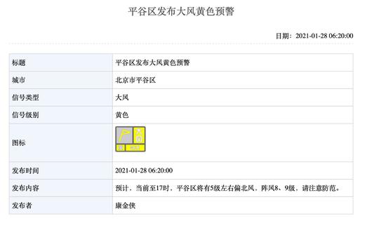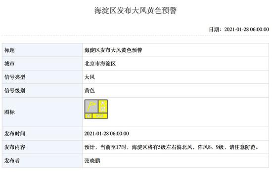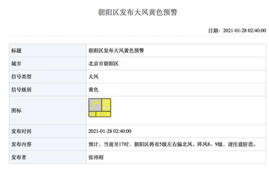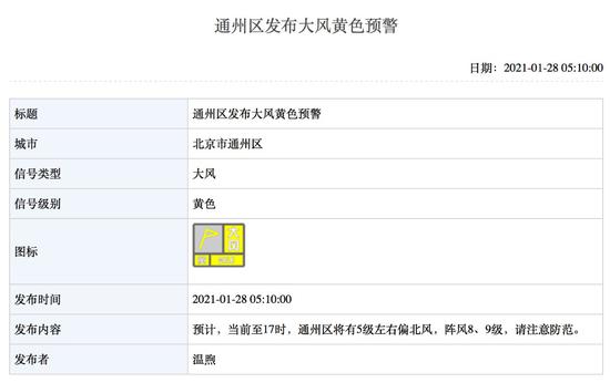 据北京气象局网站消息,截至今晨6时20分,北京朝阳、通州、昌平、海淀和平谷等区分别发布大风黄色预警。预计当前至17时,将有5级左右偏北风,阵风8、9级,请市民注意防范。