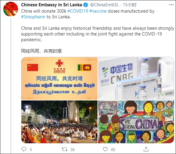 1月27日,中国驻斯里兰卡大使馆在社交平台发文称,中方将向斯里兰卡捐赠国药集团生产的30万剂新冠病毒疫苗。