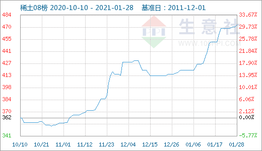 据生意社监测显示,国内稀土市场价格指数走势持续上涨,国内镨钕系稀土价格持续走高,铽系市场价格上涨至10年新高,镝系价格上涨至5年新高,国内稀土市场价格步步高升,根据生意社稀土板块指数显示,1月27日稀土指数为470点,较周期内最高点1000点(2011-12-06)下降了53.00%,较2015年09月13日最低点271点上涨了73.43%。