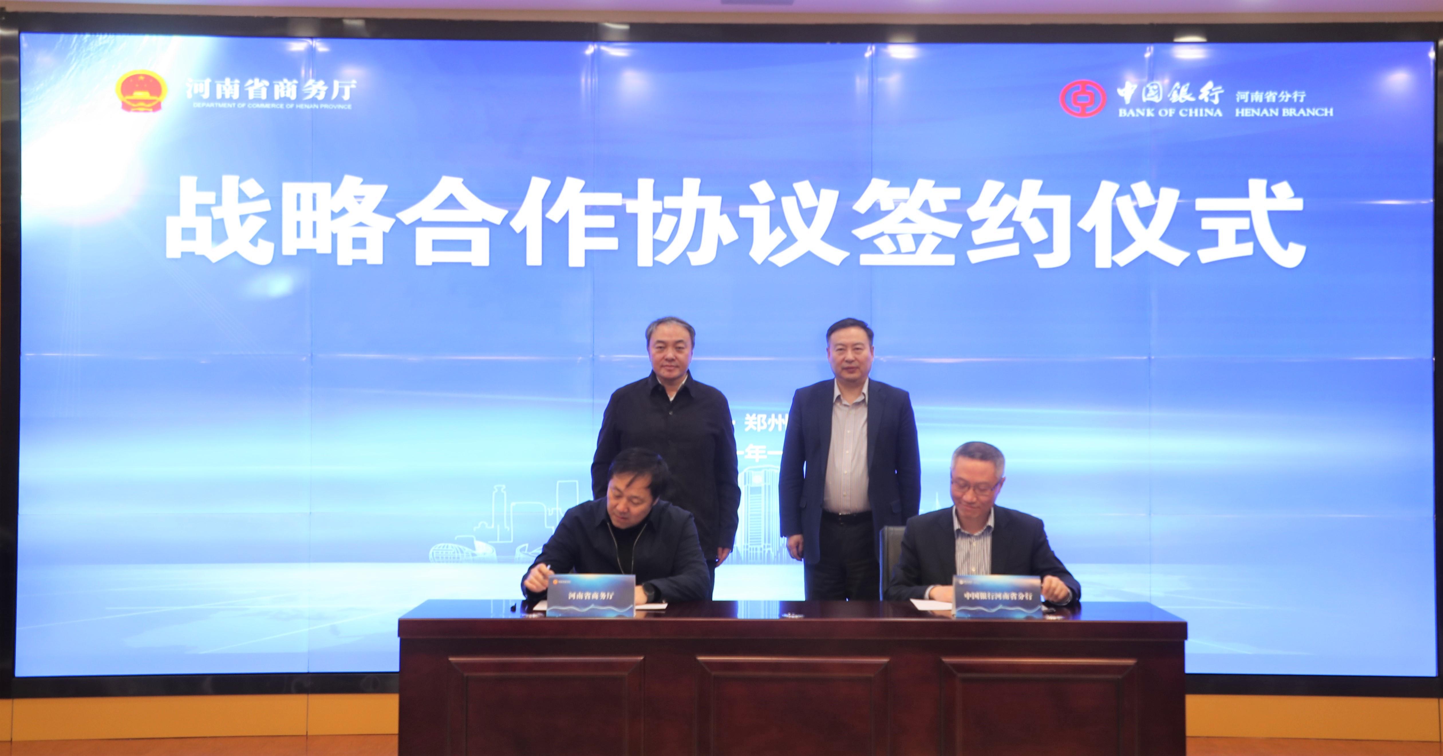 河南省商务厅厅长马健、中行河南省分行行长常冰雁出席签约仪式并致辞,省商务厅副厅长高翔与中行河南省分行副行长郭林代表双方签约。