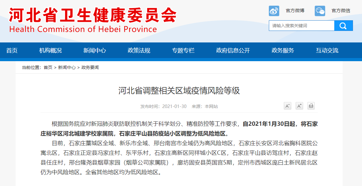 据根据国务院应对新冠肺炎联防联控机制关于科学划分、精准防控等工作要求,自2021年1月30日起,将石家庄裕华区河北城建学校家属院,石家庄平山县防疫站小区调整为低风险地区。