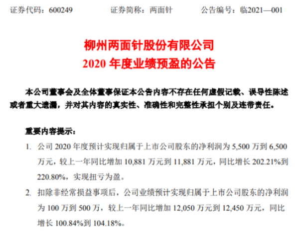 挖贝网1月29日,两面针(600249)发布2020年年度业绩预告:预计2020年度实现归属于上市公司股东的净利润为5,500万到6,500万元,较上一年同比增加10,881万元到11,881万元,同比增长202.21%到220.80%,实现扭亏为盈。