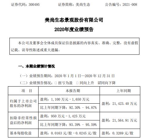挖贝网1月31日,美尚生态(300495)近日发布2020年业绩预告,预计业绩同向下降。报告期内归属于上市公司股东的净利润1,100万元-1,650万元,比上年同期下降92.30%-94.87%;基本每股收益0.0163元/股–0.0245元/股。