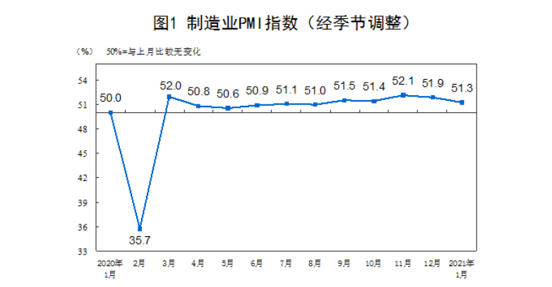 1月份,中国制造业采购经理指数(PMI)为51.3%,比上月回落0.6个百分点,连续11个月位于临界点以上,表明制造业继续保持扩张,但步伐有所放缓。