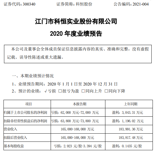 挖贝网1月31日,科恒股份(300340)近日发布2020年业绩预告,预计业绩同比由盈转亏。报告期内归属于上市公司股东的净利润亏损62,000万元-72,000万元,上年同期盈利3,043.31万元,同比由盈转亏;基本每股收益亏损2.923元/股-3.394元/股。