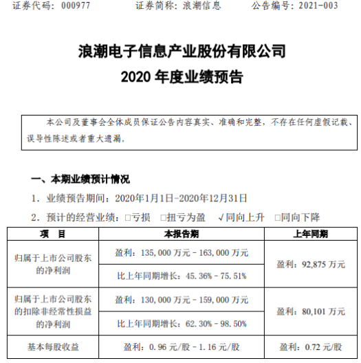 挖贝网1月30日,浪潮信息(000977)近日发布2020年业绩预告,预计业绩同向上升。报告期内归属于上市公司股东的净利润135,000万元–163,000万元,比上年同期增长45.36%–75.51%;基本每股收益0.96元/股–1.16元/股。