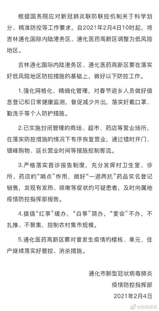根据国务院应对新冠肺炎联防联控机制关于科学划分、精准防控等工作要求,自2021年2月4日10时起,将吉林通化国际内陆港务区、通化医药高新区调整为低风险地区。
