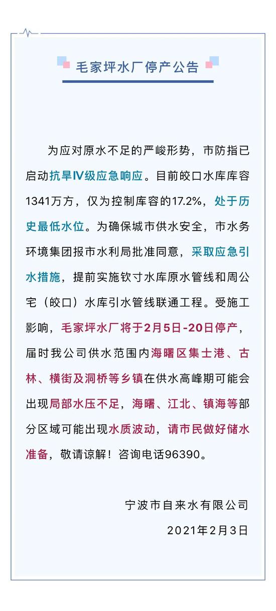 记者从宁波市防指了解到,当地的毛家坪水厂于2021年2月5日至20日暂停供水。据了解,目前毛家坪水厂只能由周公宅、皎口水库供水,两座水库都已经低于历史最低水位,皎口水库蓄水量已不到1400万立方米。为充分利用西线亭下水库等水源,缓解宁波中心城区供水紧张和水源不平衡状况,需提前应急实施联通工程,接通新建成的水库群联网西线工程与毛家坪水厂输水管道,因工程施工管网割接需要,毛家坪水厂暂停供水。