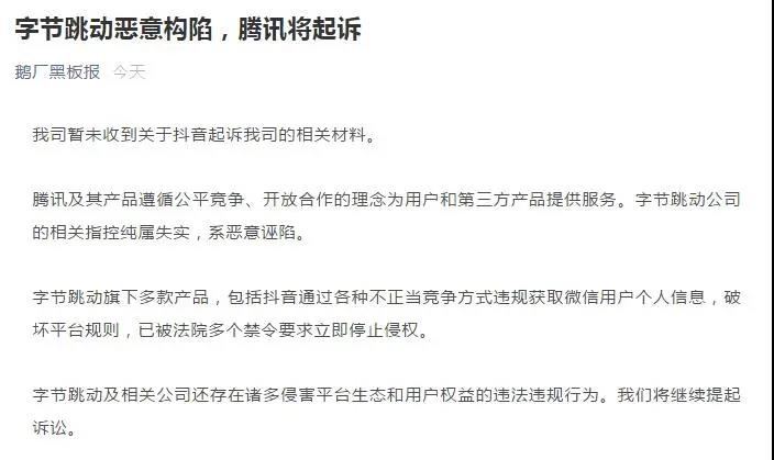 对抖音的突然起诉,腾讯回应称,字节跳动系“恶意构陷”,认为字节跳动及相关公司还存在诸多侵害平台生态和用户权益的违法违规行为,腾讯将继续提起诉讼。